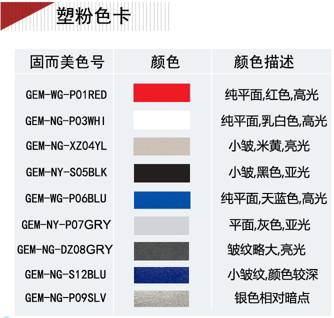 七、外殼表面顏色,以下是我們備有庫存的噴粉顏色,請(qǐng)選擇【GEM-NY-S05BLK】,如果要其他指定顏色,請(qǐng)注明勞爾色號(hào)或者潘通色號(hào)__________,需要延長周期和成本。