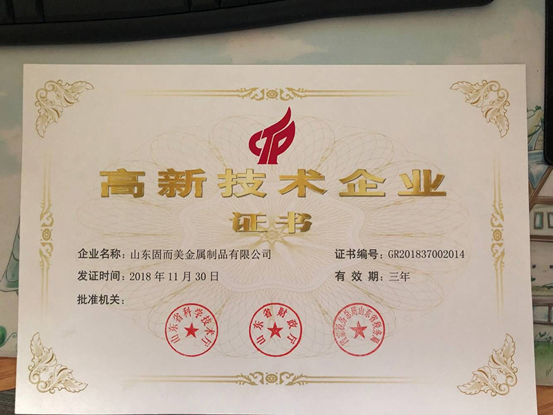 山東固而美金屬制品有限公司喜獲“國家高新技術企業”認證證書,標志著山東固而美正式邁入“國家級高企”序列。