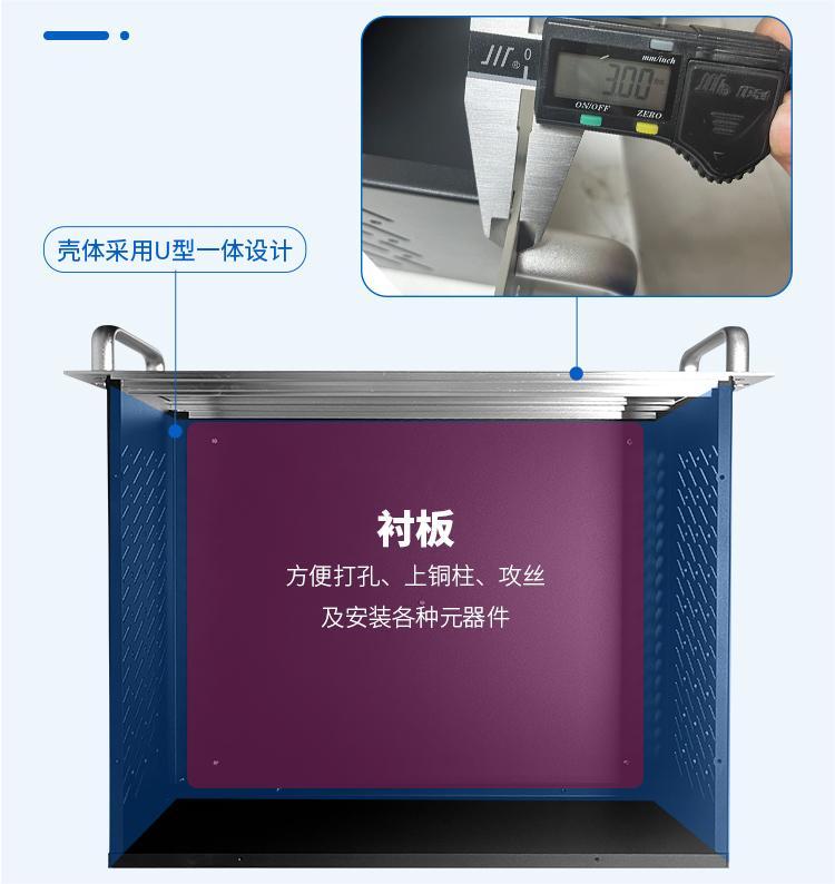 3、設(shè)計的整體性:一體化U型設(shè)計,結(jié)構(gòu)更穩(wěn)固,鋁型材前面板+鋁把手,襯板方便打孔、上銅柱、攻絲以及安裝各種元器件。